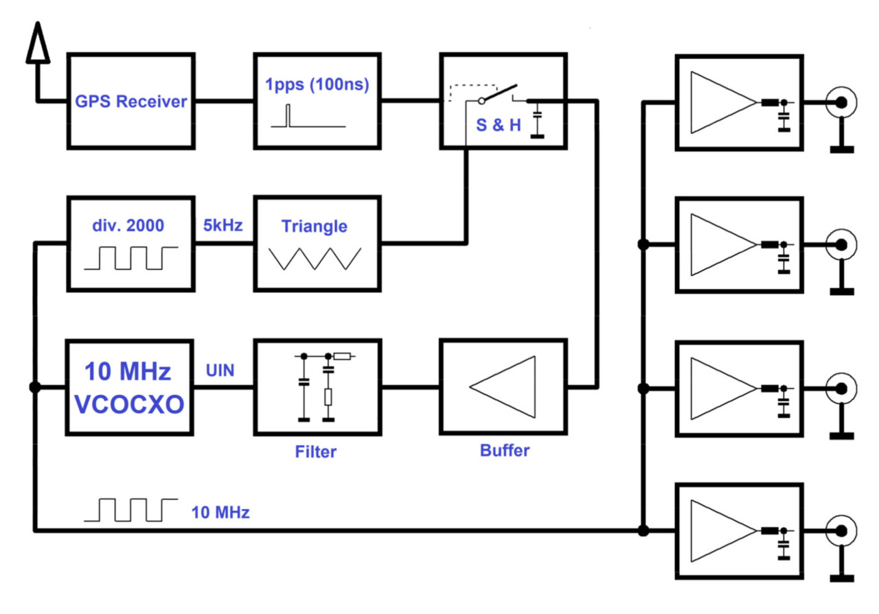 The GPS 1-PPS pulse serves as the sampling trigger for the triangular waveform. This means that once per second, the instantaneous value of the triangular waveform is captured using a sample-and-hold circuit. A triangular waveform is a linear ramp, i.e., its voltage increases linearly with time. As a result, the phase information is directly encoded in the voltage.